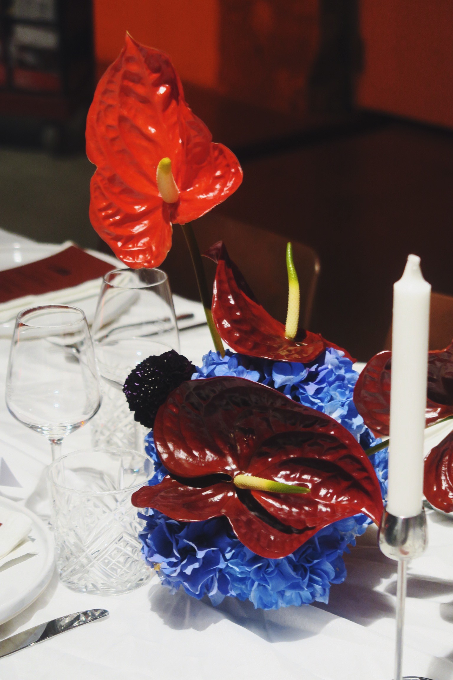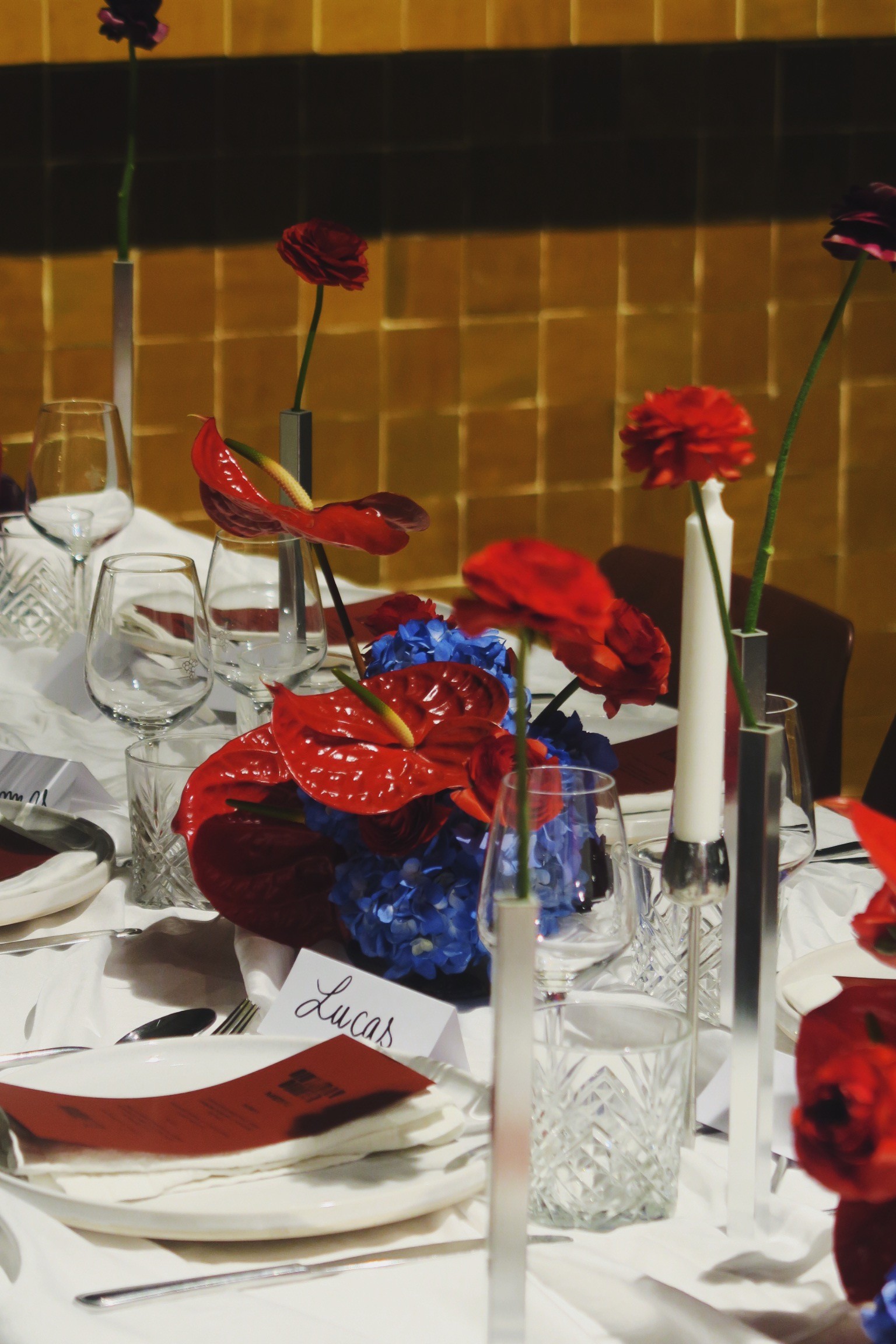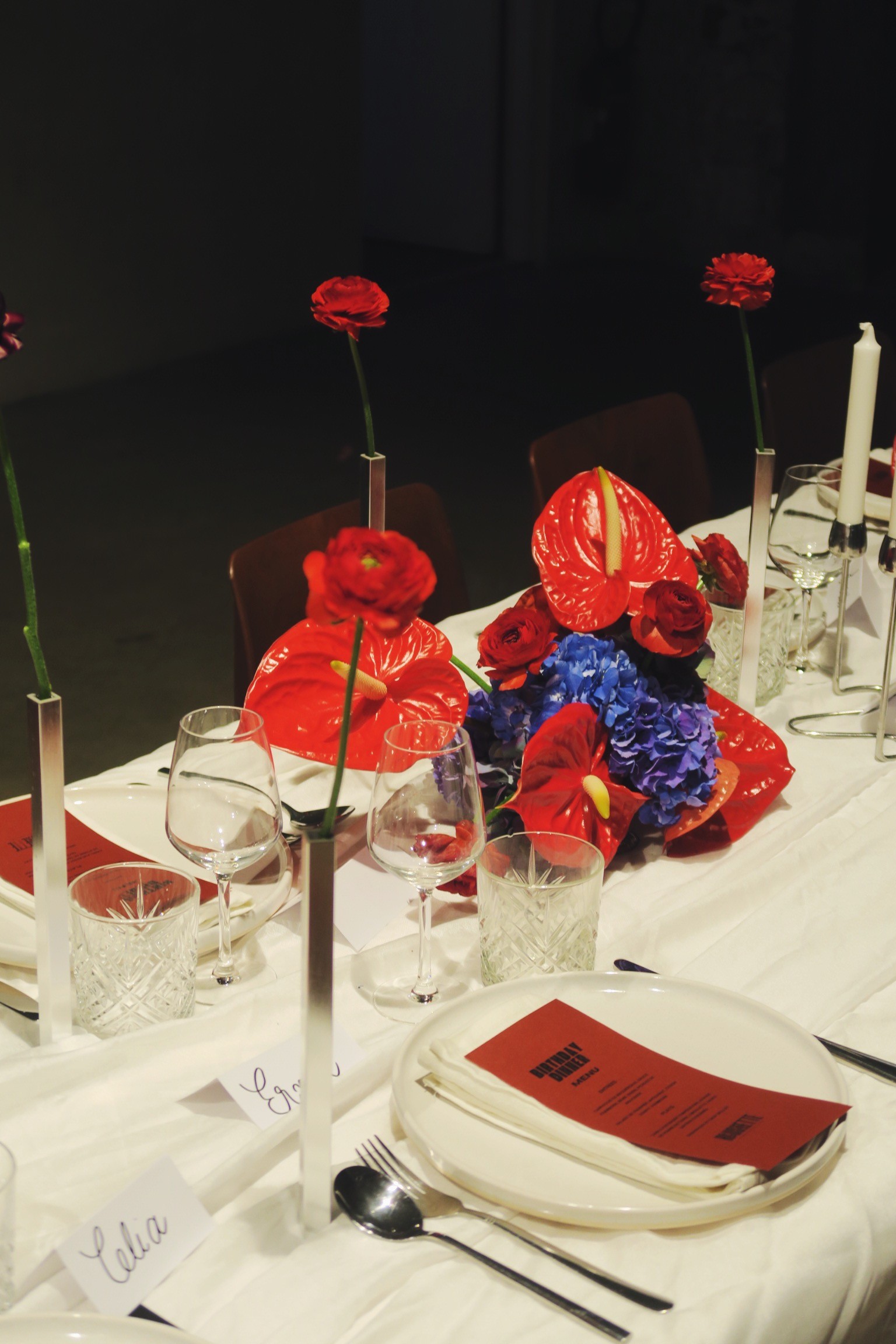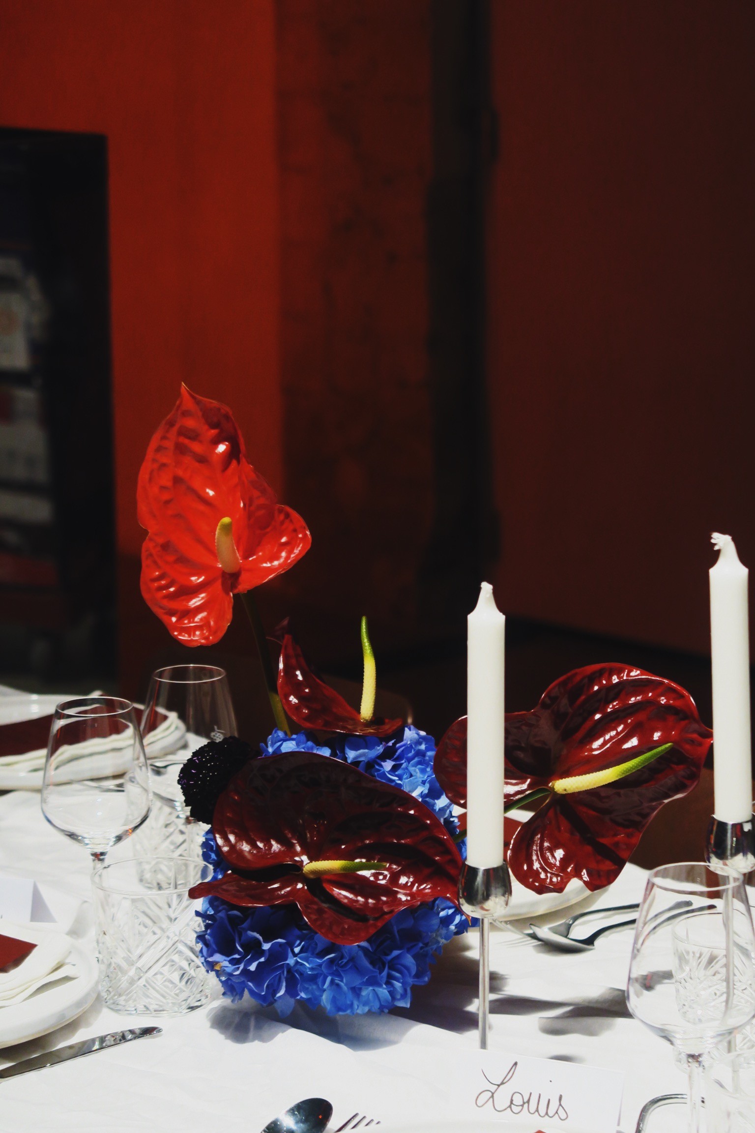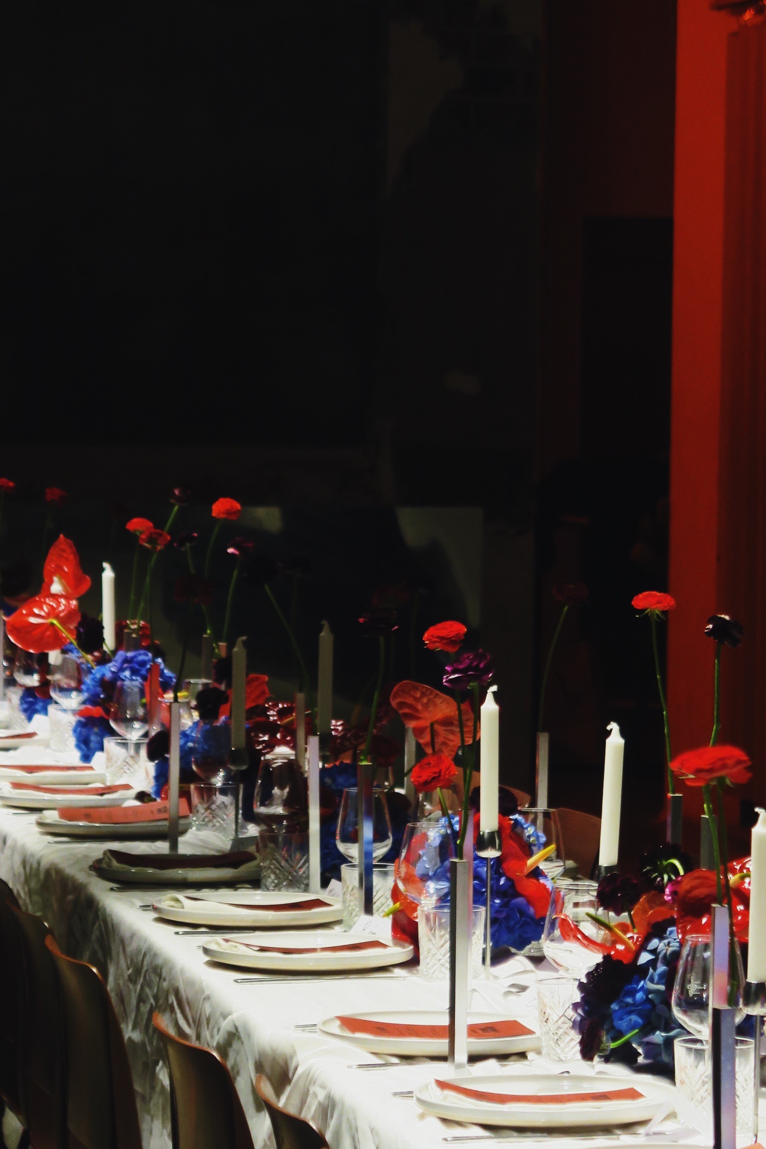 Carte blanche et palette signature : une table en bleu, rouge et bordeaux, où les couleurs se répondent comme un dialogue entre profondeur et contraste. Un événement privé à La Caserne Paris, créé avec @reusette.